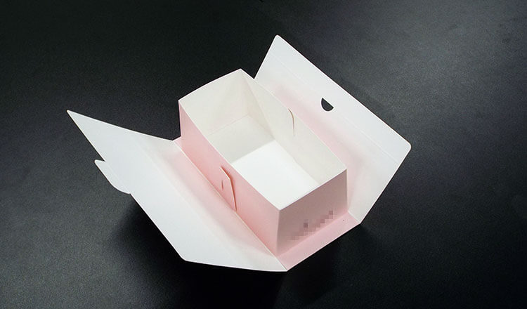 中に入る商品はロールケーキで、ショーウンドウでお客様に選んでいただき、箱の中にロールケーキを入れお渡しするための化粧箱パッケージです。箱の形状をN式箱と言います。